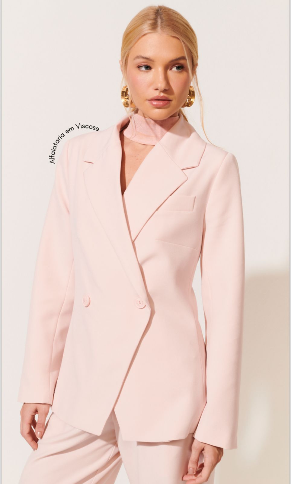 Blazer alongado, acinturado, com fechamento transpassado e abotoamento duplo frontal,